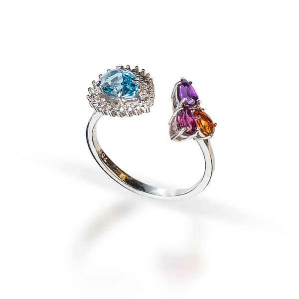 Anel em ouro branco gota de topázio com pedras Ametista, Rodolita, Citrino, Topázio e Diamantes , Largura aprox.= 1,6mm Peso médio=2,9grs.
